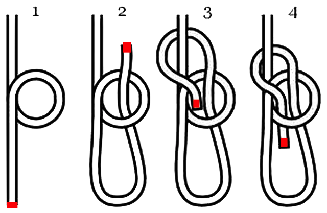 - 1,2 – a loop is made into the standing part which will act as the rabbit's hole